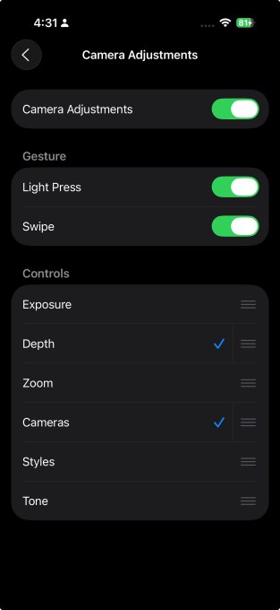 You can adjust or turn off camera controls through a new Camera Adjustments menu.