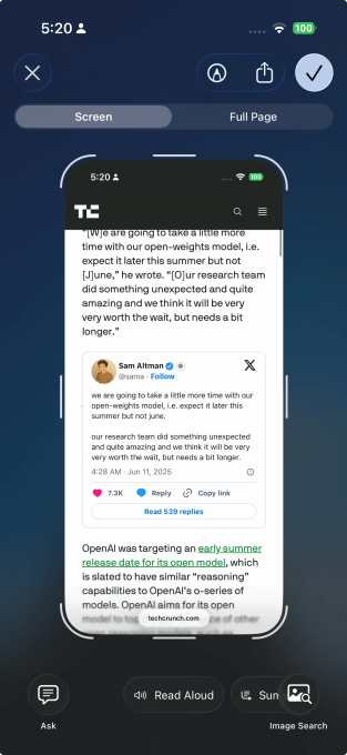 The screenshot menu has a new layout. You can ask questions about a screenshot thanks to visual intelligence. If there’s content on the screen, the menu will automatically suggest summarizing it or reading it aloud.