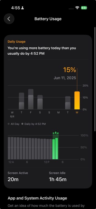 The battery menu has a new performance view. Previously, it showed performance over the last 24 hours and 10 days through a toggle. Now there is a day and a week view on one screen. Plus, it also has a comparative indicator that tells you if you are using more or less battery on a day based on time.