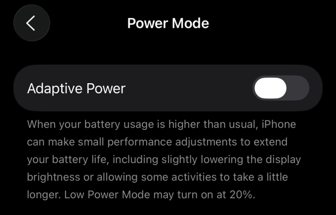 The battery section now has an adaptive power mode. When you turn that on, iPhone might reduce brightness or slow down some apps to save battery at a time when there is higher battery consumption.