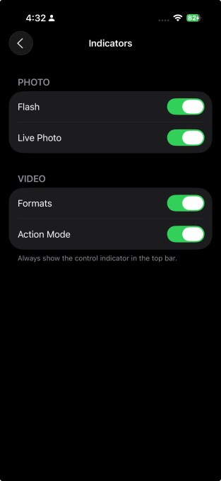 You can now show or hide indicators for Flash, Live Photo, video formats, and Action Mode in the camera through the new Indicators settings.