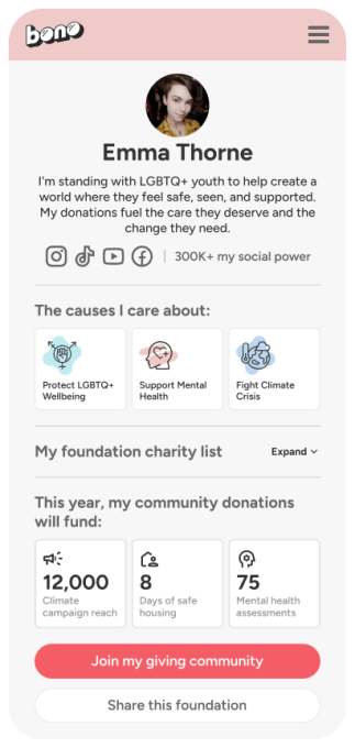 The platform (named after the phrase “pro bono,” not the singer of the same name) focuses on connecting users with a selection of vetted charities based on which causes they care about, such as the climate crisis, LGBTQ+ rights, ending animal suffering, and more. Users set a monthly plan, starting at $5 per month, and Bono automatically distributes funds across the chosen charities.