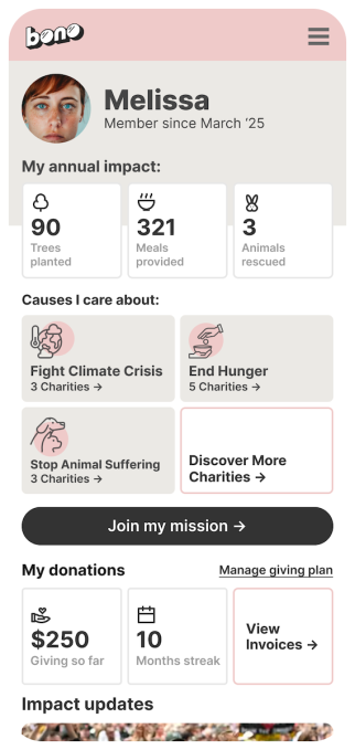 To keep users engaged and informed, Bono provides a weekly impact report, detailing how and where their donations are making a difference. For instance, it shows how many meals or mental health sessions their donations paid for. There’s also a mobile app (available on iOS and Android devices) to see their annual impact.