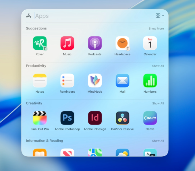 Spotlight is getting a visual redesign, allowing users to browse more easily through apps, files, clipboard history, and more. All these results are now listed together, and are ranked “intelligently” based on relevance to users.