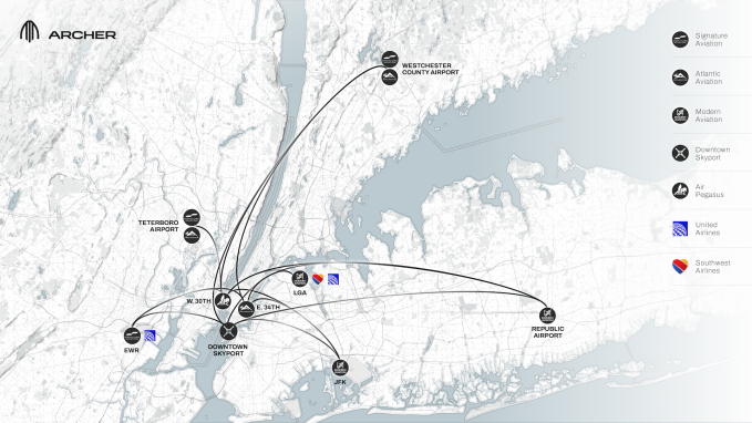 In NYC, United will help with aircraft storage, maintenance, charging setup, and setting up vertiports (landing pads for eVTOLs) at airports. Archer has also teamed up with the fixed-base operators that run the Manhattan helipads — Atlantic Aviation, Signature, and Modern Aviation — which, Goldstein says, will give Archer passenger access and help set up the charging infrastructure.