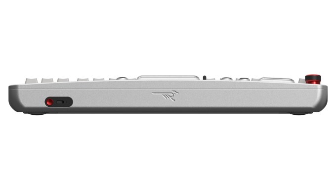 The keyboard is aluminum, with floating keys and a red control knob. The system is launching on Kickstarter in February, with a planned late-2025 shipping.