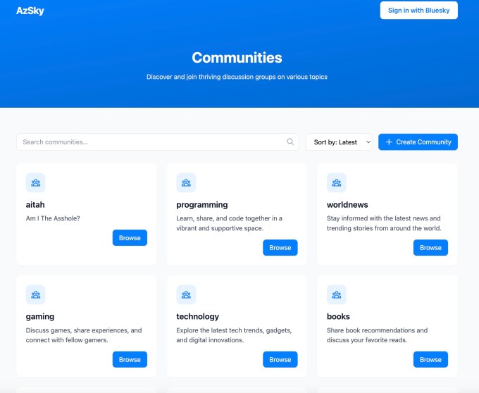 An open social alternative to a discussion forum site like Reddit, AzSky is powered by Bluesky. Users can join communities and engage in discussions with others who share their interests across topics like news, technology, gaming, movies, books, and more. You can also track “trending” conversations taking place across Bluesky from AzSky, which are those discussions that have hundreds (or even thousands) of comments.