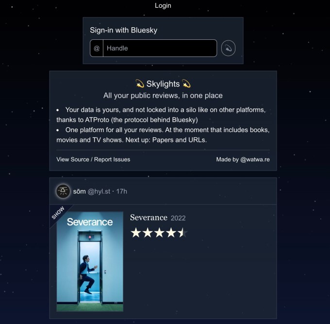 Not to be confused with the video app Skylight above, Skylights is a public reviews platform built on AT Proto where you can review books, movies, and TV shows, with plans to add support for reviewing papers and URLs in the future. Unlike traditional review platforms, the data you share on Skylights is yours, not “locked into a silo,” the website notes.