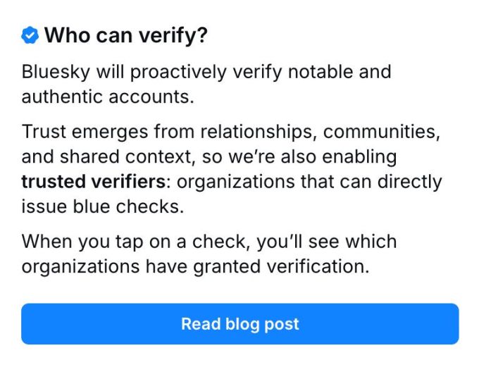 While Bluesky already lets users verify themselves by tying their accounts to official websites, CEO Jay Graber has hinted the company would try other types of verification. Last year, Graber said Bluesky may experiment with a system where it’s not the only group that can verify users.