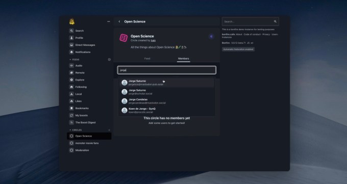 Those who lived through the Google+ era of social networks may be familiar with the concept of Circles. On Google’s social network, users organized contacts into groups, called Circles, for optimized sharing. That concept lives on at Bonfire, where a circle represents a list of people. That can be a group of friends, a fan group, local users, organizers at a mutual aid group, or anything else users can come up with. These circles are private by default but can be shared with others.