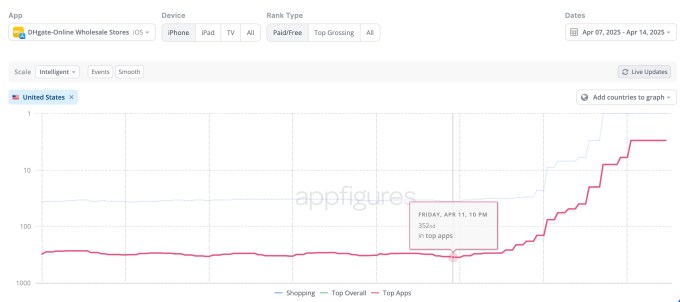For comparison, the app was ranked No. 352 in the top non-game free iPhone apps category in the U.S. as of Friday, April 11, before jumping to No. 6 on Sunday and No. 3 on Monday, according to data from app intelligence provider Appfigures. On Monday, DHgate also climbed to No. 3 on the Top Overall chart for free iPhone apps, including games.