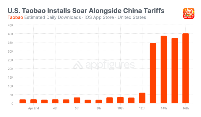 In April, Taobao’s estimated downloads totaled approximately 185,000 — a 514% increase from the 30,000 it saw during the same period last month, according to new data from app intelligence provider Appfigures. As with DHgate, Taobao’s downloads surged over this past weekend, with installs increasing 5.7x between last Friday and Saturday, the firm said.