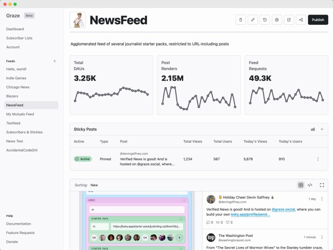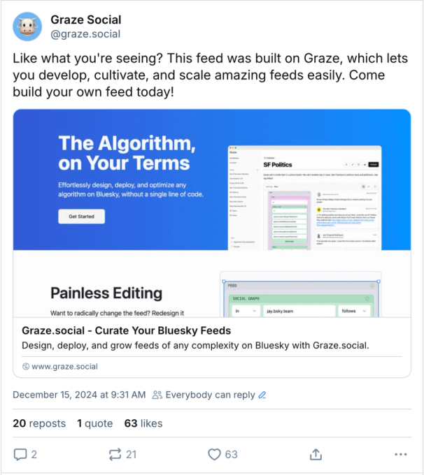 In November, they began building Graze, a tool that gives Bluesky users the ability to “create their own algorithm,” so to speak, in the form of custom feeds built with complex logic, multiple filters, and rules. And its tools have rapidly taken off.