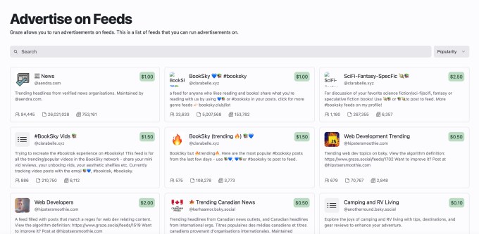 Graze also respects Bluesky’s existing privacy guidelines — meaning the ads are not targeted by collecting users’ personal data and or demographic info, but rather by which feeds the advertiser wants to reach. (Presumably, a cat food brand would do well advertising in a feed focused on cats, for example.)