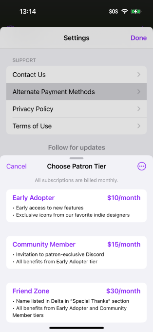 Delta still includes a way to pay through Apple’s in-app purchases, as is still required. However, it’s tucked away under an “Alternative Payment Methods” menu in the Settings screen — an option many users will likely never seek out.