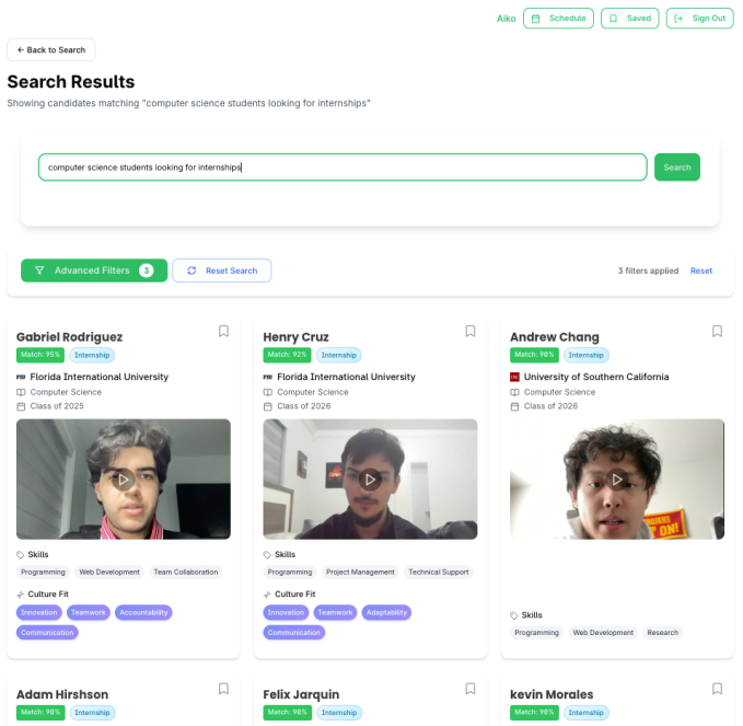 On the employer side, companies can filter through video resumes to find the right candidates for their open roles. They can look for candidates from a specific top school or with specific skills. After that, they will see a bunch of video resumes displayed alongside percentages based on how much their expertise aligns with their company’s culture and requirements for the position.