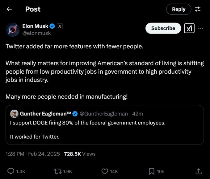 “Twitter added far more features with fewer people,” said Musk in a post on X Monday.