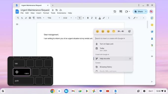 The quick insert key, which also acts as a Caps key, will open a new menu with access to the Gemini-powered “Help me write” tool, emoji and GIF search, recent browsing history to quickly copy links, Google Drive integrated search, and tools to do quick calculations, add dates, or convert units.