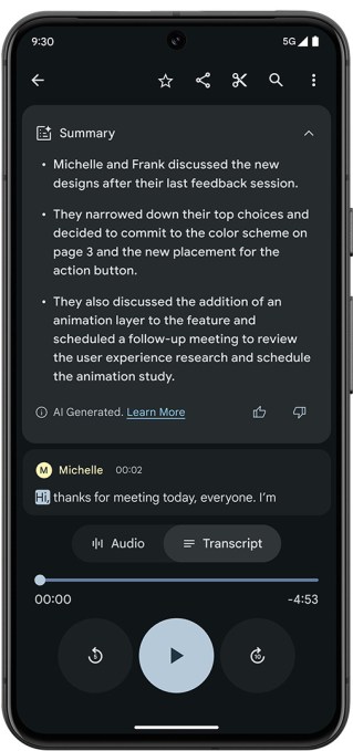 The Recorder app, which lets users push a button to record and transcribe audio, includes a Gemini-powered summary of recorded conversations, interviews, presentations, and other audio snippets. Users get summaries even if they don’t have a signal or Wi-Fi connection — and in a nod to privacy, no data leaves their phone in process.
