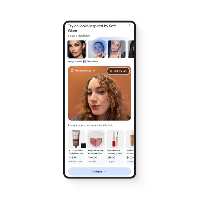 To use the AR beauty capability, mobile users can search things like “soft glam,” a trendy makeup look, and then select “See the looks on you” and “Try it on,” to then virtually wear neutral eyeshadows, rosy blush, lip gloss, and more.