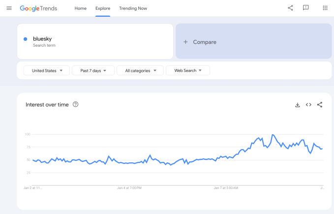 Over the same period, Google searches “facebook alternatives” have also seen a bump, as have searches for Bluesky and Mastodon, two decentralized social media platforms that have been gaining in popularity since Elon Musk took over Twitter and renamed it X.