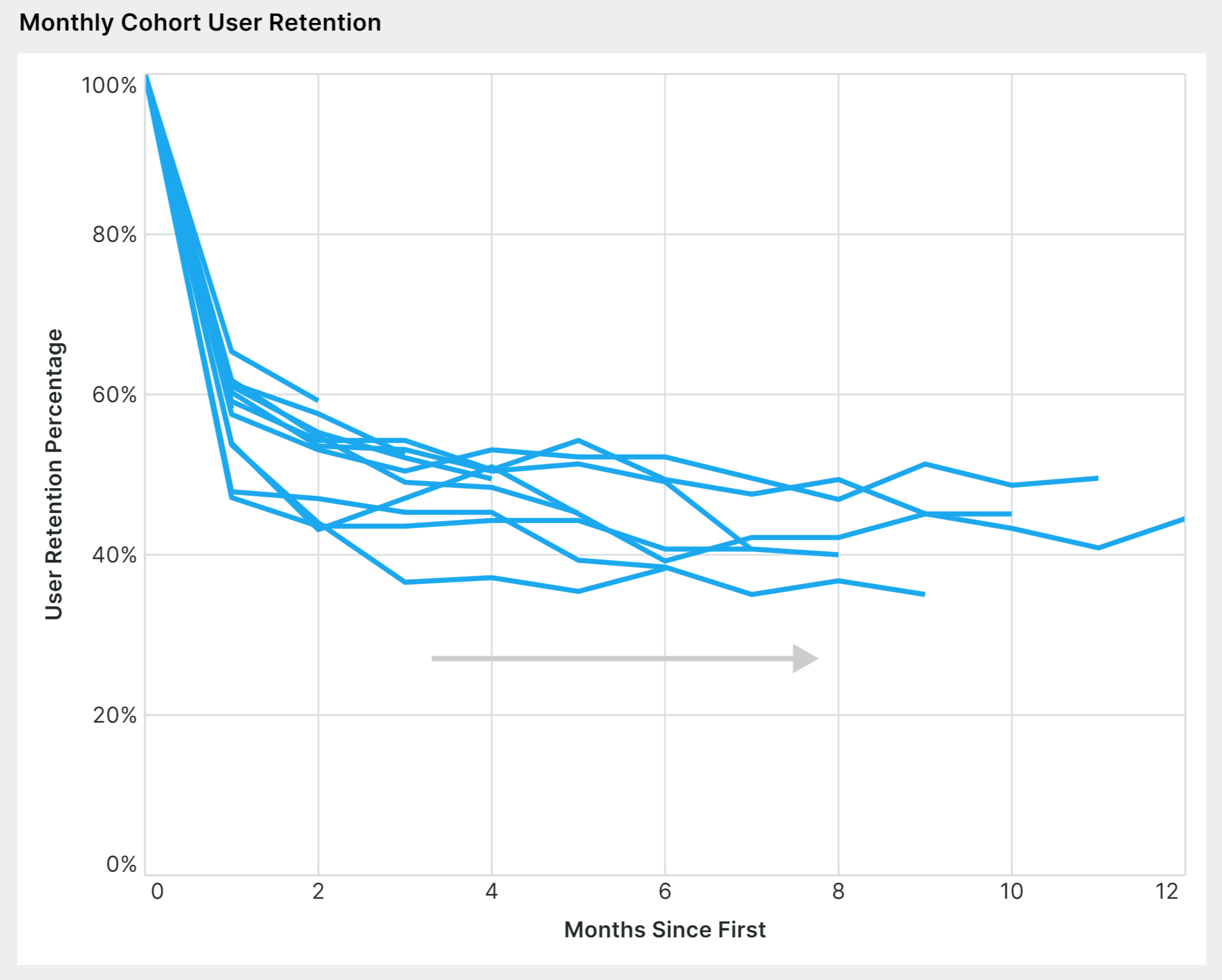 You want to see “flattening” retention curves for each cohort: User numbers will drop over time, but after a few months, they should plateau. This flattening is depicted in the chart below, where each line represents a cohort of users who started in the same month.