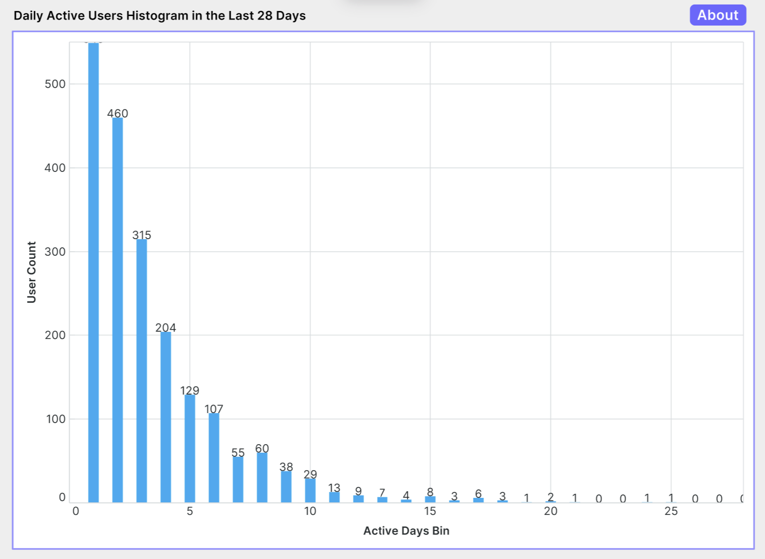 Identify those users and what they love about your product. Since this only requires the most recent 28 days of data, the DAU histogram chart doesn’t require you to build up a lot of historical data.