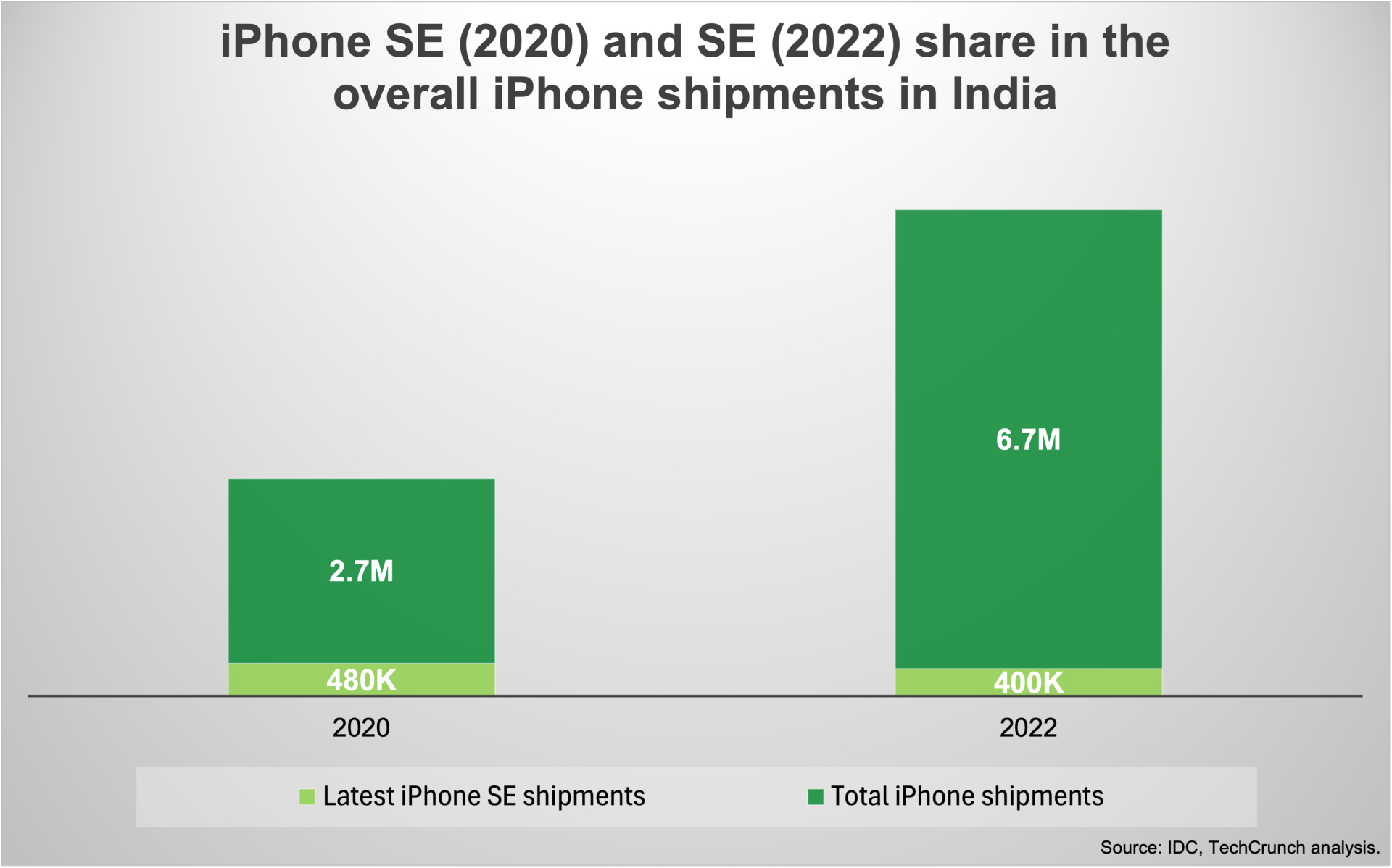 Even as Apple has expanded in India, the iPhone SE has seen a proportional decline. The iPhone SE (2020) represented 18% of overall iPhone shipments in its launch year, while the iPhone SE (2022) made up 6% of total shipments two years later, per IDC data shared exclusively with TechCrunch. In contrast, the iPhone 13 made up nearly 40% of iPhone shipments in 2022.