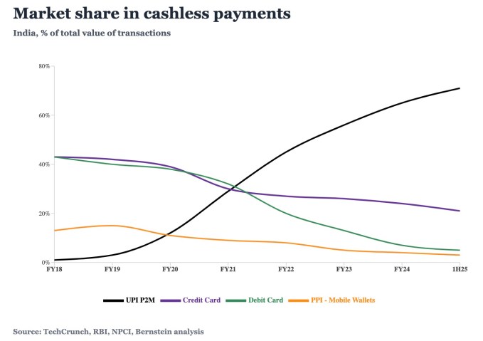 The UPI network now processes more than 13 billion real-time transactions monthly — that’s about 71% of all transactions in the world’s most populous nation — and accounts for 36% of all consumer spending in the country, according to an analysis by Bernstein.