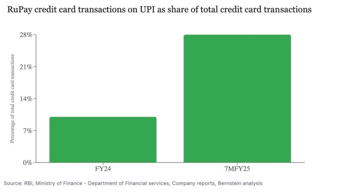 These figures now account for 28% of all credit card transactions in India, up from 10% last year, according to Bernstein. (RuPay’s credit card figures don’t include swipes at merchant outlets and some other transactions, as that data isn’t available, so its market share is likely even higher.)