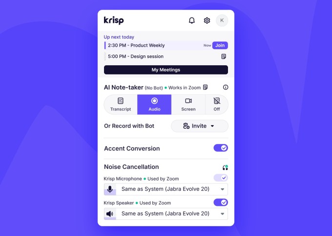 The startup says the accent conversion process preserves the speaker’s voice and only switches phonemes to match American accents. The feature has apparently been tested in enterprise environments, and a beta version is now coming to the Krisp desktop app. Users can turn the feature on any time during or before calls.