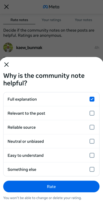 Even if a majority of Meta’s contributors believe a Community Note is needed, it doesn’t mean one will be shown. Further, Meta says it won’t downrank a post or account in its algorithms even if a Community Note is shown on a post.