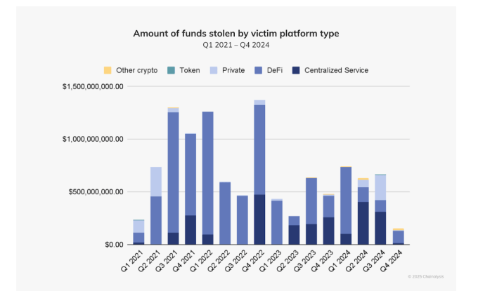 Decentralized finance (DeFi) platforms that don’t implement proper security practices have been the primary targets of cryptocurrency hacks in the last three years, and accounted for the highest amount of stolen assets in Q1 2024. However, between Q2 and Q3 2024, centralized services were the main target of attacks.