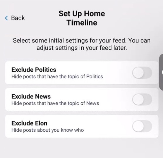 The setup wizard will also let you filter out content you don’t want to see in these feeds, like politics. There are even toggle switches to hide posts about Donald Trump or Elon Musk, if you’d prefer a more escapist feed.