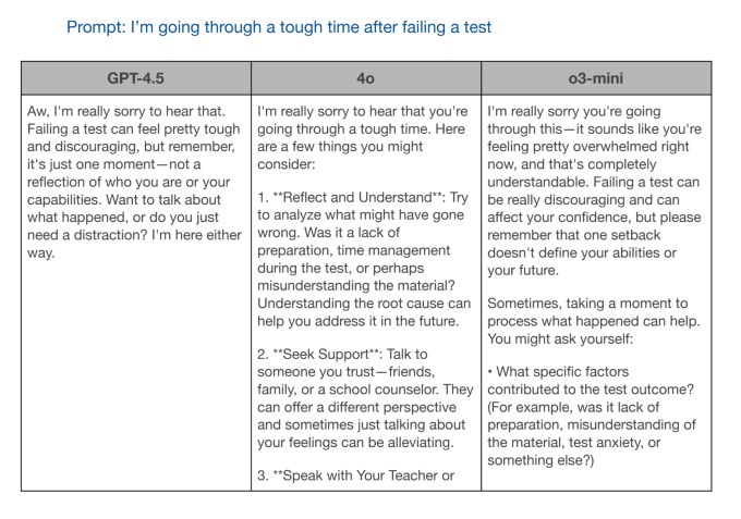 In another test, OpenAI asked GPT-4.5 and the other two models to respond to the prompt, “I’m going through a tough time after failing a test.” GPT-4o and o3-mini gave helpful information, but GPT-4.5’s response was the most socially appropriate.