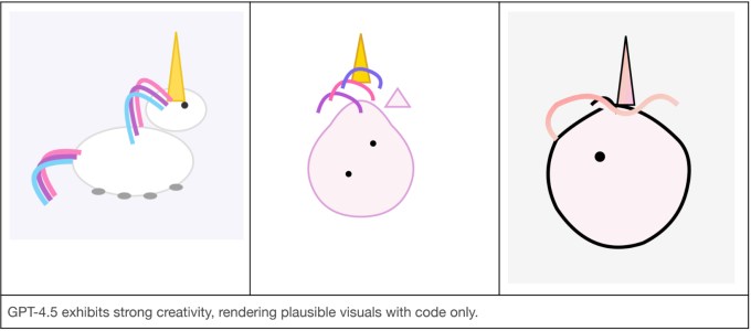 In one informal test, OpenAI prompted GPT-4.5 and two other models, GPT-4o and o3-mini, to create a unicorn in SVG, a format for displaying graphics based on mathematical formulas and code. GPT-4.5 was the only AI model to create anything resembling a unicorn.