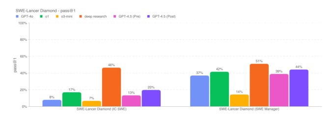 On a subset of coding problems, the SWE-Bench Verified benchmark, GPT-4.5 roughly matches the performance of GPT-4o and o3-mini but falls short of OpenAI’s deep research and Anthropic’s Claude 3.7 Sonnet. On another coding test, OpenAI’s SWE-Lancer benchmark, which measures an AI model’s ability to develop full software features, GPT-4.5 outperforms both GPT-4o and o3-mini, but doesn’t best deep research.