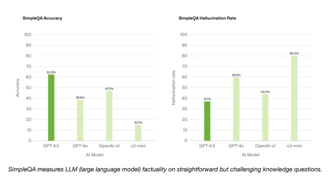 On OpenAI’s SimpleQA benchmark, which tests AI models on straightforward, factual questions, GPT-4.5 outperforms GPT-4o and OpenAI’s reasoning models, o1 and o3-mini, in terms of accuracy. According to OpenAI, GPT-4.5 hallucinates less frequently than most models, which in theory means it should be less likely to make stuff up.