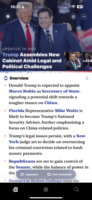 However, the app’s killer feature is an AI chatbot that lets you ask questions and get instant answers about a story. The app will include suggested questions and those asked by others. For example, if you’re reading about Trump’s immigration policy plans, you could ask the chatbot things like “What are the potential legal challenges to Trump’s deportation plans?” or “What are the potential costs of mass deportation?” among other things. Particle will then use its AI technology to find those answers and fact-check them for accuracy.