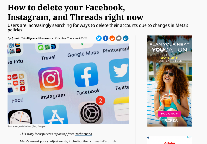 This was a weird article to turn into a 300-word AI-generated summary. The Quartz article’s headline — “How to delete your Facebook, Instagram, and Threads right now” — hints at a how-to piece similar to mine. But its account deletion instructions are vague: