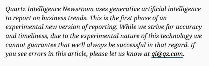 The quality control seems to be lacking, however, going by one article that Quartz’s AI newsroom sourced from TechCrunch last week.
