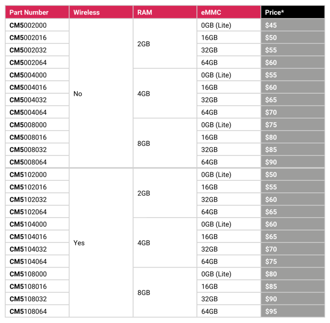 Just as with the Compute Module 4, there are a ton of options. You can choose Compute Modules with or without wireless technologies; with 2GB, 4GB, or 8GB of RAM and with up to 64GB of on-board flash storage.