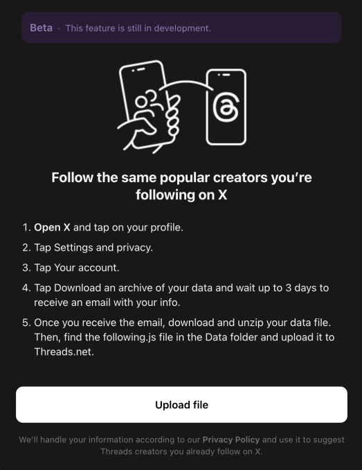 When opening the Threads mobile app on Wednesday, some users, including TechCrunch, were shown a pop-up saying they can now “Find popular creators from X.” The pop-up takes users to the beta feature, which provides instructions on how to download their following list from X and import it to Threads.