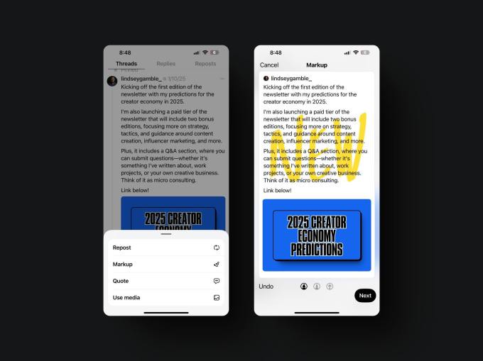 It’s an odd sort of addition for Threads, given that users are more often sharing something clipped from the web, like a news article, where they’ve added a highlight or underline in a screenshot. There hasn’t been much consumer demand for a tool to mark up Threads’ posts directly.