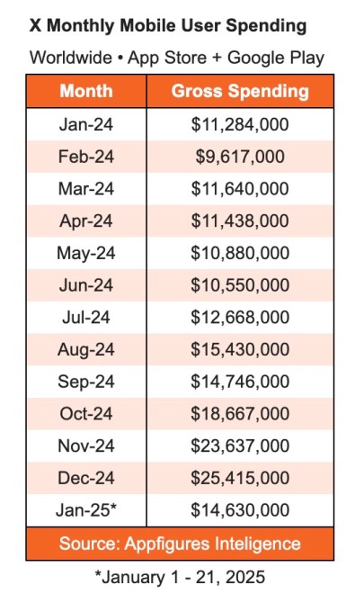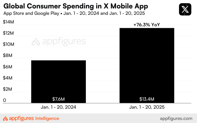 In an analysis performed by Appfigures, X’s global consumer spending on iOS and Android reached $7.6 million for the period of January 1-20, 2024. During the same time in January 2025, X saw $13.4 million in consumer spending, the firm said. This figure includes in-app purchases made through X’s mobile apps — not revenue from advertising or subscriptions bought on the web, where X users receive a discount on their purchases.