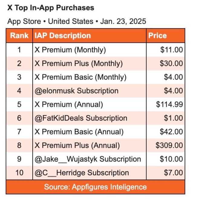 The top in-app purchases on the X iOS app in January 2025 are as follows: No. 1 is the X Premium Monthly subscription ($11/mo.), followed by the X Premium Plus Monthly subscription ($30/mo.), X Premium Basic Monthly ($4/mo.), a subscription to Elon Musk’s account directly ($4/mo.), and X Premium’s Annual Subscription ($114.99/yr.).