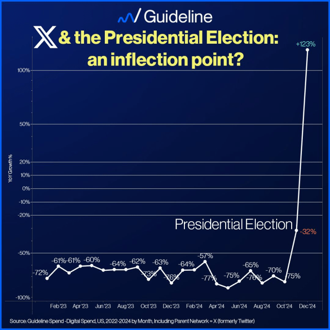 While the data shared by Appfigures and Sensor Tower focuses on consumer spending, there are indications that X’s advertising business is on the upswing, too. According to ad spend data provider Guideline, X saw a 123% improvement in ad spend in December 2024, after declines of -32% in November, down from 60-80% declines it saw over the past two years.