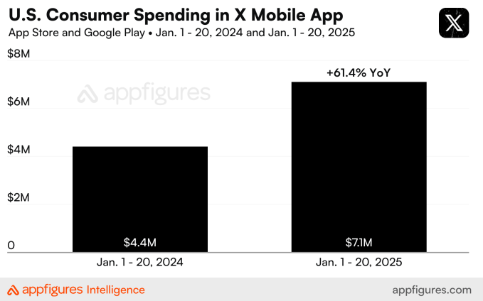 In the U.S., X saw 61.4% growth in year-over-year consumer spending on iOS and Android, growing from $4.4 million from January 1-20, 2024, to $7.1 million during the same period in 2025.